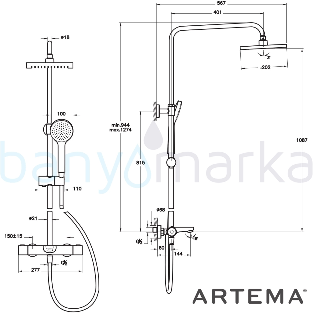 | Genel Açıklamalar: | 21 mm çapında ana kolon. Duş başlığının yukarı-aşağı yükseklik ayarı için teleskopik özellik. Termostatik batarya, 1F duş başlığı ve 1F el duşu ürüne dahildir. 202x202 mm kare tepe duşu. 100 mm çapında el duşu. Armatür üzerindeki 2 yollu yönlendirici suyu duş başlığı veya el duşuna yönlendirir. Alttan el duşu çıkışlı (G 1/2") duş veya banyo bataryaları ile kullanılmalıdır. Sıva altı montaj yapılmadan kullanılmaktadır. |