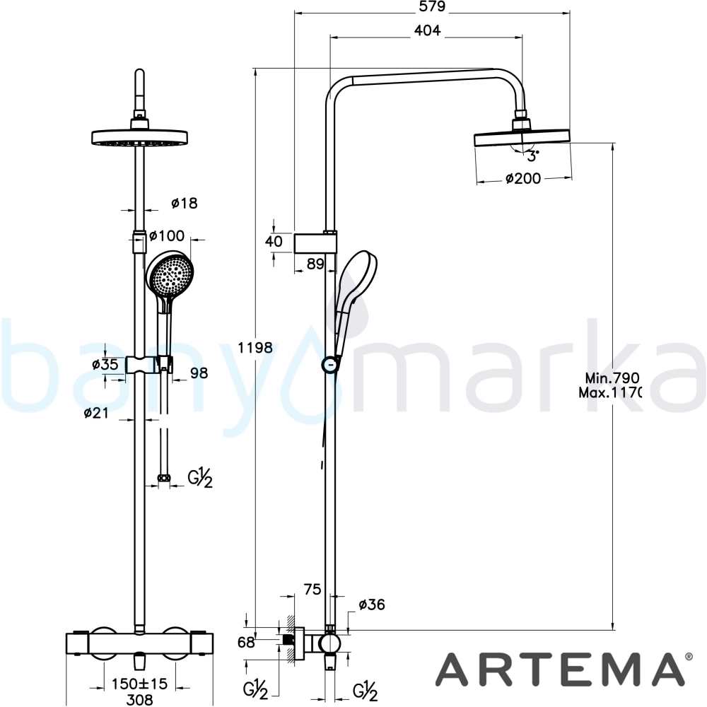| Ürün Adı: | Artema Base Round 200 Duş Kolonu ve Termostatik Duş Bataryası Sistemi, Mat Siyah |