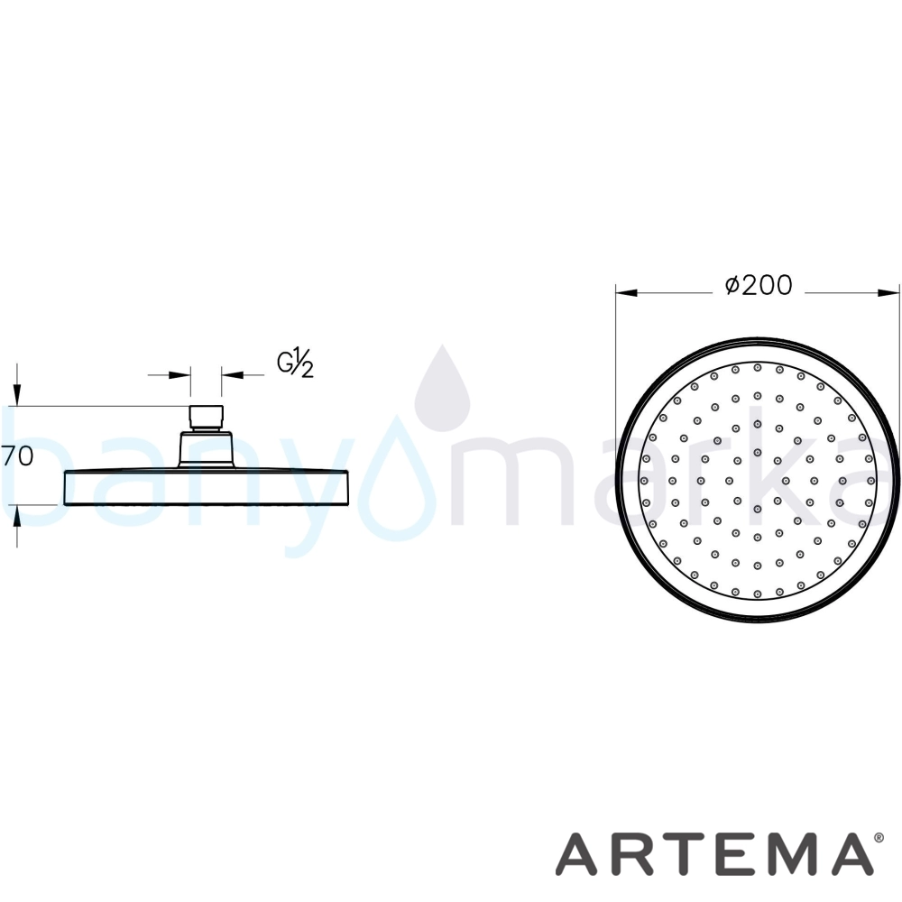 Artema Base Round Duş Başlığı, 20 cm, Tek Fonksiyonlu, Mat Siyah