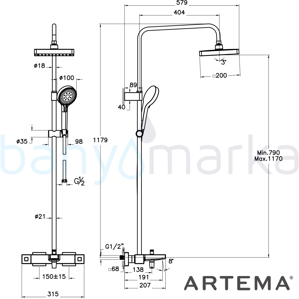 | Ürün Adı: | Artema Base Square 200 Duş Kolonu ve Termostatik Banyo Bataryası Sistemi |