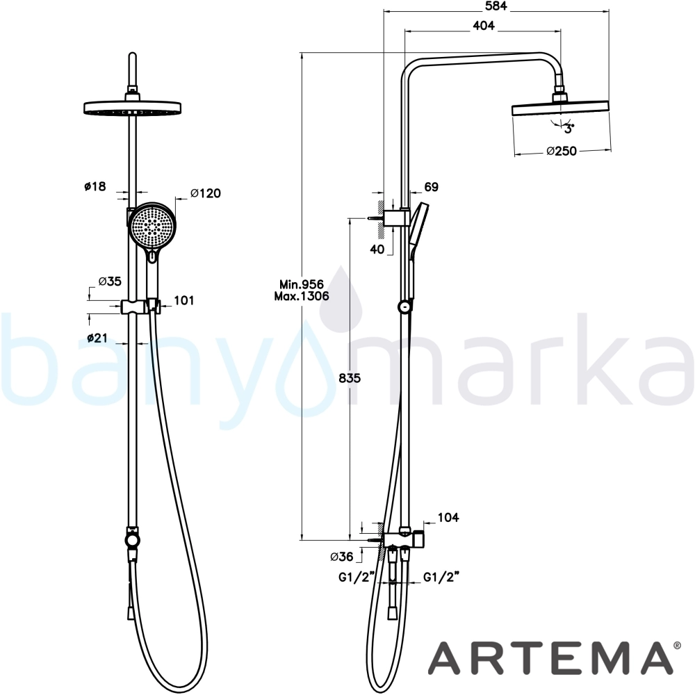 | Genel Açıklamalar: | 21 mm çapında kolon. 250mm duş başlığı ürüne dahildir. 120mm çapında El duşu ürüne dahildir. Tek fonksiyonlu duş başlığı: Aquarain. Üç fonksiyonlu el duşu: Aquasoft, Aquamassage, Aquamassage + Aquasoft. Duş başlığının yukarı-aşağı yükseklik ayarı için teleskopik özellik. Chroma-tech spiral uzunluğu 1500mm. Batarya ile duş kolonu arası bağlantı spirali uzunluğu 500 mm dir ve ürüne dahildir. Kolon üzerindeki 2 yollu yönlendirici suyu duş başlığı veya el duşuna yönlendirir. Alttan el duşu çıkışlı (G 1/2) duş veya banyo bataryaları ile kullanılmalıdır. Sıva altı montaj yapılmadan kullanılmaktadır. Bataryanın üst tarafı raf olarak kullanılabilir. Duş başlığı mafsalı 15 derece hareket kabiliyeti vardır. |