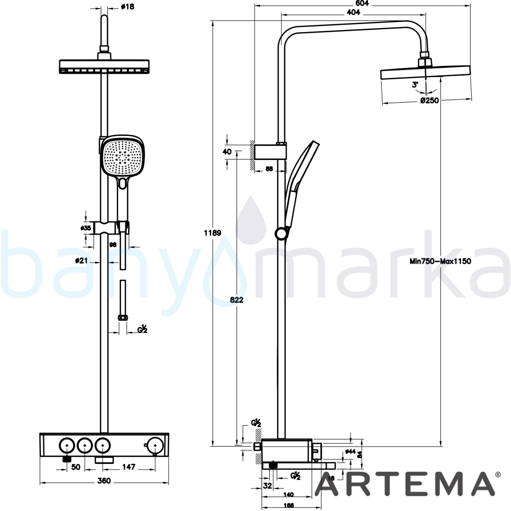 | Ürün Adı: | Artema Core Square 250 Duş Kolonu ve Termostatik Banyo Bataryası Sistemi, Parlak Siyah |