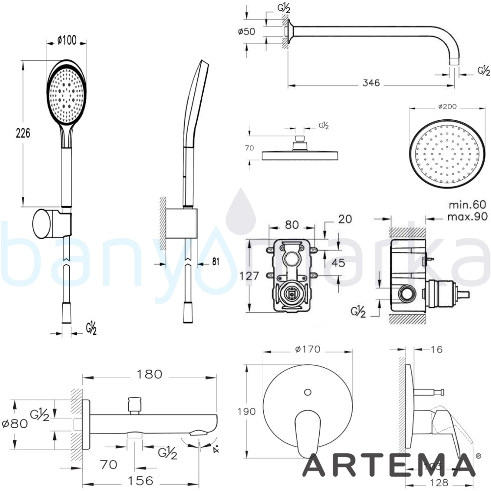 | Uyarı ve Genel Açıklamalar: | A43182 kodlu Artema Flow Round Ankastre Banyo Bataryası (Sıva Üstü Grubu), A41949 kodlu Artema Ankastre Banyo Bataryası (Sıva Altı Grubu, Minibox), A45904 kodlu Artema Base Round Duş Başlığı, 20 cm, Tek Fonksiyonlu, A45652 kodlu Artema Duvardan Dirsek (Uzun), A45907 kodlu Artema Base Round El Duşu Takımı ve A43126 kodlu Artema Root Round Çıkış Ucu, El Duşu Çıkışlı sete dahildir. |