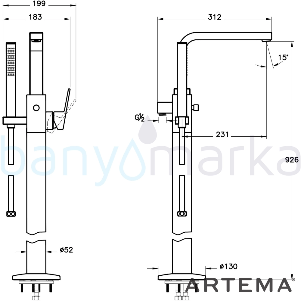 | Ürün Adı: | Artema Minimax Square Yerden Küvet Bataryası, El Duşlu, Soft Bakır |