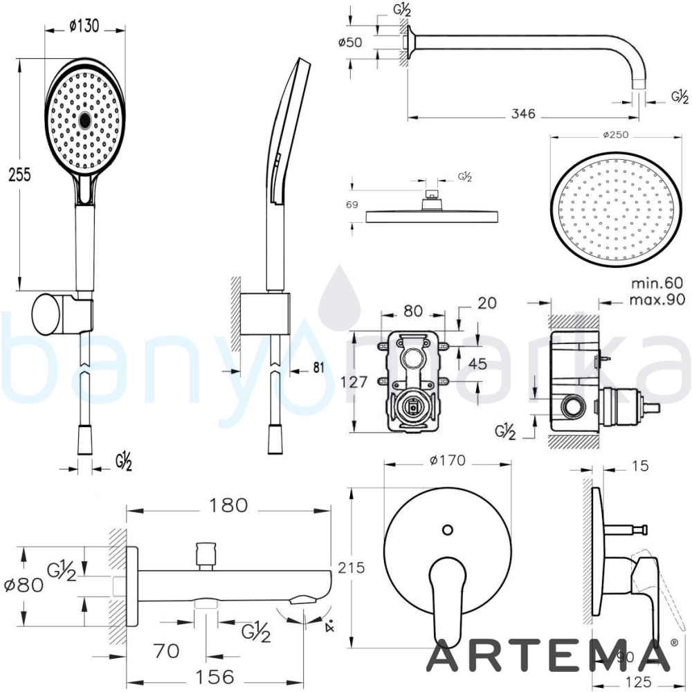 | Uyarı ve Genel Açıklamalar: | A4272736 kodlu Artema Root Round Ankastre Banyo Bataryası, Mat Siyah (Sıva Üstü Grubu), A41949 kodlu Artema Ankastre Banyo Bataryası (Sıva Altı Grubu, Minibox), A4591236 kodlu Artema Core Round Duş Başlığı, 25 cm, Tek Fonksiyonlu, Mat Siyah, A4565236WTC kodlu Vitra Origin Duvardan Dirsek (Uzun), Mat Siyah, A4592436 kodlu Vitra Prime Round 3F El Duşu Takımı, Mat Siyah ve A4312636 kodlu Artema Root Round Çıkış Ucu, El Duşu Çıkışlı, Mat Siyah sete dahildir. |