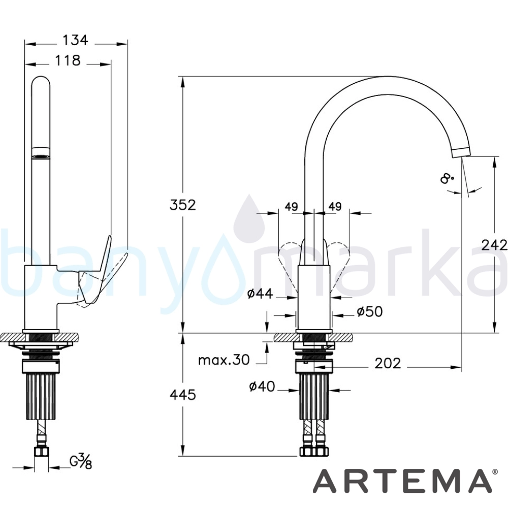 Marka: Artema Ürün Adı: Artema Shift T10 Eviye Bataryası (C-Tip) Ürün Kodu: A43654 Seri: Shift T10 Yüzey Rengi: Krom Enerji Tasarrufu: Var-kartuş ile Çıkış Ucu Uzunluğu: 202 mm Çıkış Ucu Yüksekliği: 242 mm Perlatör Özelliği: Su tasarruflu Açma / Kapama: Tek kumandalı Kartuş Özelliği: Isı ve debi ayarlı Ücretsiz Montaj: Yok Yetkili Servis Hizmeti: Var Garanti Süresi: 10 yıl Üretim Yeri: Türkiye Uyarı ve Genel Açıklamalar: Çıkış ucu uzunluğu 202 mm dir. Çıkış ucu yüksekliği 242 mm dir. 360 derece döner boruludur. Isı ve debi limitörlü özel kartuş. Özel debi kısıcılı perlatör sayesinde max. 5 L/dk su akışı sağlanmaktadır. Kumanda kolu sağ veya sol tarafta kullanım için uygundur.