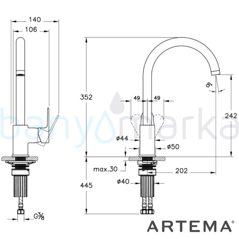 Marka: Artema Ürün Adı: Artema Shift T20 Eviye Bataryası (C-Tip) Ürün Kodu: A43674 Seri: Shift T20 Yüzey Rengi: Krom Enerji Tasarrufu: Var-kartuş ile Çıkış Ucu Uzunluğu: 202 mm Çıkış Ucu Yüksekliği: 242 mm Perlatör Özelliği: Gizli perlatör Açma / Kapama: Tek kumandalı Kartuş Özelliği: Isı ve debi ayarlı Ücretsiz Montaj: Yok Yetkili Servis Hizmeti: Var Garanti Süresi: 10 yıl Üretim Yeri: Türkiye Uyarı ve Genel Açıklamalar: Çıkış ucu uzunluğu 202 mm dir. Çıkış ucu yüksekliği 242 mm dir. 360 derece döner boruludur. Isı ve debi limitörlü özel kartuş. Özel debi kısıcılı perlatör sayesinde max. 5 L/dk su akışı sağlanmaktadır. Kumanda kolu sağ veya sol tarafta kullanım için uygundur.