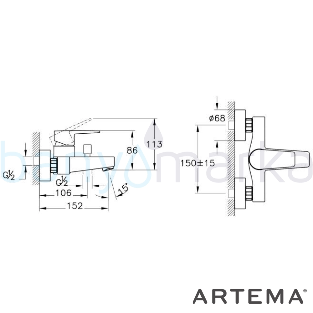 Marka: Artema Ürün Adı: Artema Shift T30 Banyo Bataryası, Mat Siyah Ürün Kodu: A4369036 Seri: Shift T30 Yüzey Rengi: Mat Siyah Çıkış Ucu Uzunluğu: 152 mm Perlatör Özelliği: Standart Açma / Kapama: Tek kumandalı Kartuş Özelliği: Isı ve debi ayarlı Ücretsiz Montaj: Yok Yetkili Servis Hizmeti: Var Garanti Süresi: 5 yıl Üretim Yeri: Türkiye Uyarı ve Genel Açıklamalar: El duşu çıkışı G 1/2 dir. Duş kumandası kilitlemelidir. Çıkış ucu uzunluğu 152 mm dir. Isı ve debi limitörlü özel kartuş. Garanti Bilgisi:5 Yıl Artema garantisi -