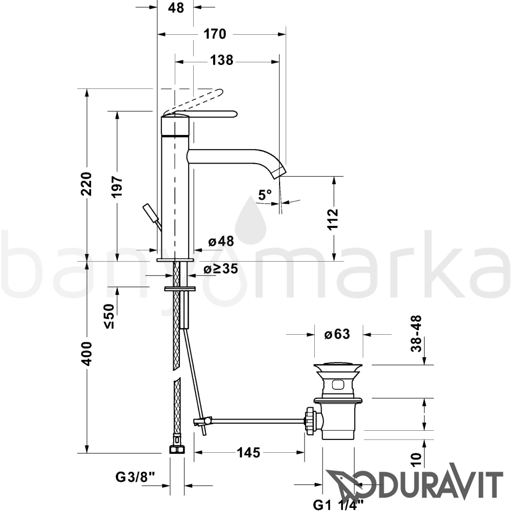 Marka: Duravit Ürün Adı: Duravit Balcoon Lavabo Bataryası, Sifon Kumandalı, Mat Siyah (M-Boy) Ürün Kodu: BA1023001046 Seri: Balcoon Yüzey Rengi: Mat Siyah Tasarımcı: Patricia Urquiola Su Tasarrufu: Var Enerji Tasarrufu: Var Çıkış Ucu Uzunluğu: 138 mm Çıkış Ucu Yüksekliği: 112 mm Perlatör Özelliği: Açılı perlatör Açma / Kapama: Tek kumandalı Kartuş Özelliği: Seramik Salmastra Fotosel Özelliği: Yok Sifon Kumandası: Var(Kumandalı sifon dahil) Ücretsiz Montaj: Yok Yetkili Servis Hizmeti: Var Garanti Süresi: 5 yıl Üretim Yeri: Almanya Uyarı ve Genel Açıklamalar: FreshStart, MinusFlow, Seramik kartuş, Yükseklik: 197 mm, Çıkış boyu: 138 mm, Bağlantı türü: Fleks bağlantı hortumları, 3/8 inç, Spray modu: Normal akış, Aerator, önerilen çalışma basıncı: 1 - 5 bar, pop-up sifon kumandalı set, Kulp donanımı: açma kolu. Siyah Mat, Akış hızı (3 bar): 4 l/min. Garanti Bilgisi:5 Yıl Duravit garantisi -