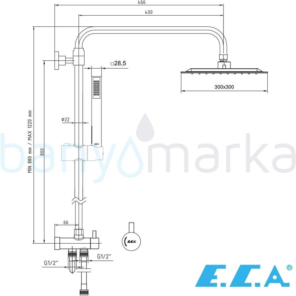 | Genel Açıklamalar: | 300x300 mm duş başlığı. Tek fonksiyonlu el duşu. Ürün yüksekliği min 880 mm - max 1220 mm dir. Teleskobik özelliği sayesinde duş başlığının konum ayarı yapılabilmektedir. Duş başlığı akış ekseni 466 mm. 150 cm burkulmaz el duşu spirali. 80 cm karışım suyu giriş spirali. 2 yollu özel mekanizmalı yön değiştirici. |
