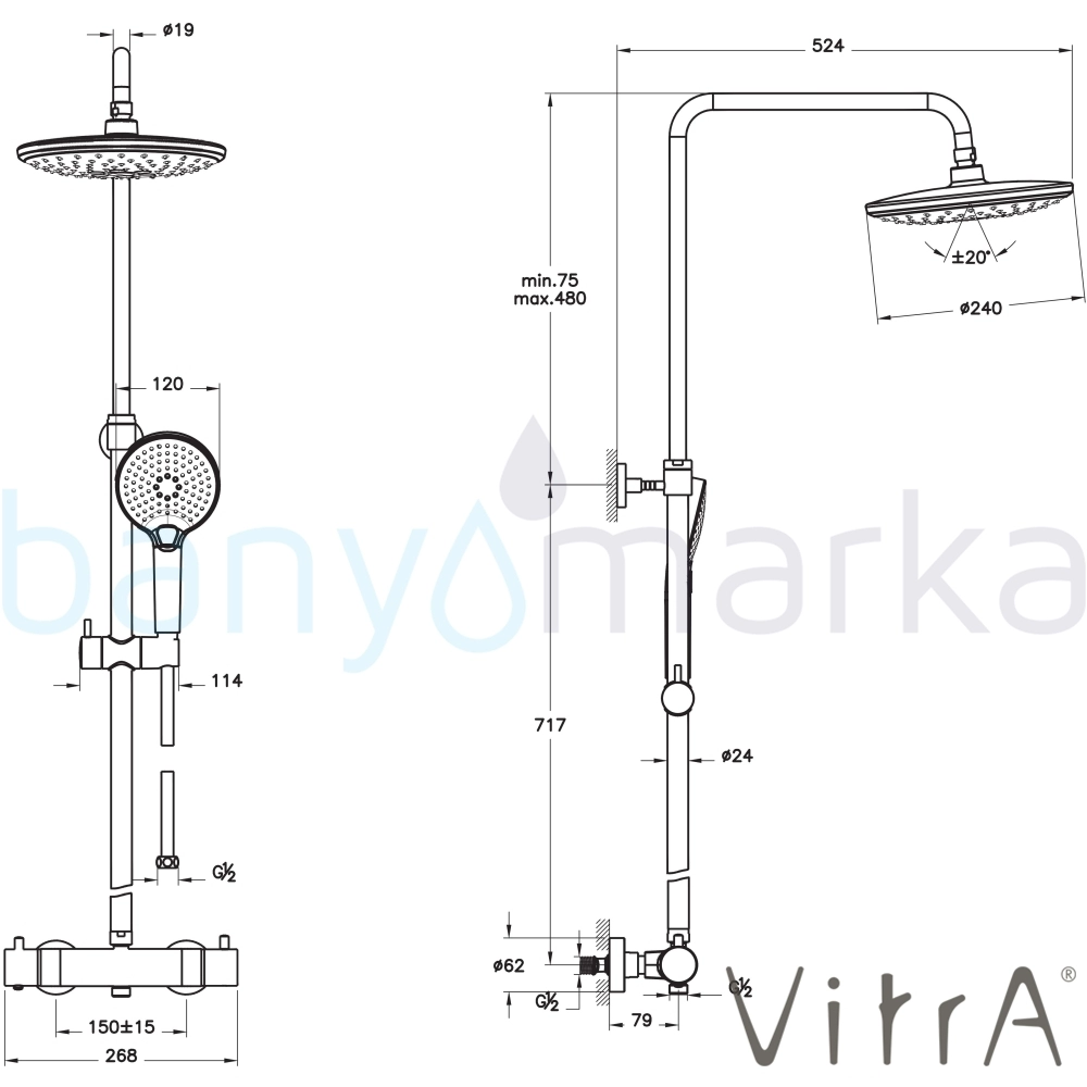 | Genel Açıklamalar: | 24 mm çapında ana kolon. Duş başlığının yukarı-aşağı yükseklik ayarı için teleskopik özellik. Termostatik batarya, duş başlığı ve el duşu ürüne dahildir. 240 mm çapında tepe duşu. 120 mm çapında el duşu. Armatür üzerindeki 2 yollu yönlendirici suyu duş başlığı veya el duşuna yönlendirir. 38 derece üzerindeki sıcaklıklara istenmeden çıkılmasını engelleyici emniyet butonu. Sıva altı montaj yapılmadan kullanılmaktadır. |