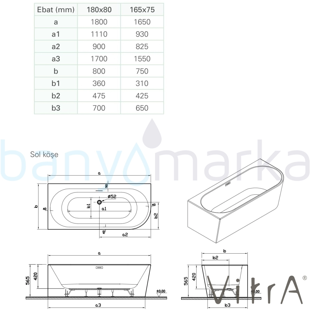 Vitra Geo 165x75 Sol Köşe Oval Küvet (Ayak ve Dikdörtgen Taşmalı Sifon Dahil), Beyaz