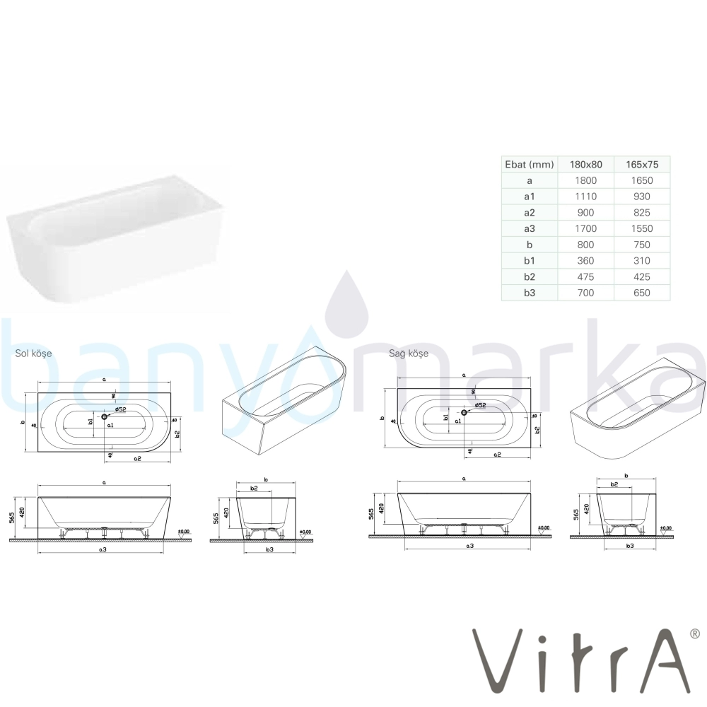 | Genel Açıklamalar: | Hidromasaj uygulaması yoktur. Köşe bağlantılı küvet. Gizli taşmalı sifon. |
