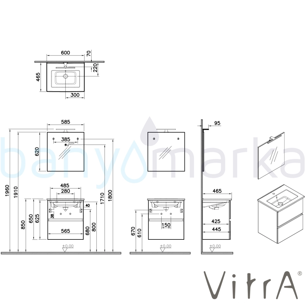 | Ürün Adı: | Vitra Mia Plus Square Demonte Set, 60 cm, Çift Çekmeceli, (Lavabo Dolabı, Aydınlatmalı Ayna), Cordoba |