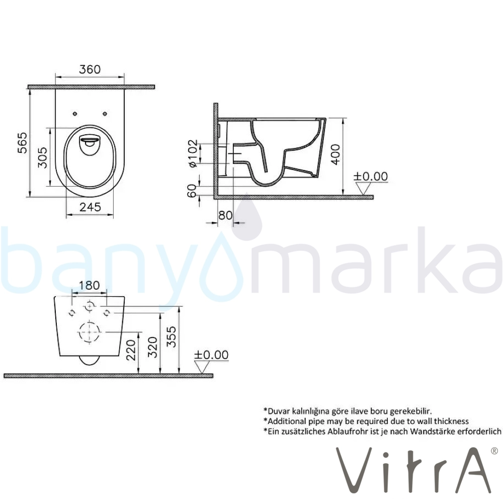 Su Tasarrufu: 3-6 litre Pis Su Çıkış: Duvardan Montaj Tipi: Montaj deliksiz gizli sistem Taharet Borusu Giriş: Sıva altı Taharet Borusu: Var Yetkili Servis Hizmeti: Var Ücretsiz Montaj: Yok Garanti Süresi: 10 yıl Üretim Yeri: Türkiye Ölçüler: 360x565 mm. Uyarı ve Genel Açıklamalar: VitrA Hygiene + VitrA Clean. Taharet borusuz. Klozet kapağı hariçtir. Ayrıca sipariş verilmelidir. 220-003R009 ve 230-003R009 yavaş kapanır klozet kapağı ile uyumludur. Su tasarruflu 762-XXXX-01 ve 768-XXXX-01 kodlu gömme rezervuarlar ile uyumludur. Garanti Bilgisi:10 Yıl Vitra garantisi -