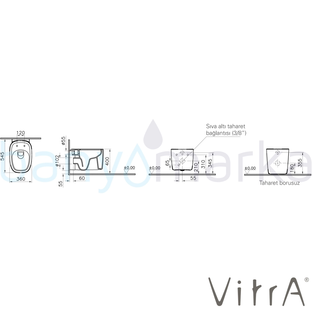 Marka: Vitra Ürün Adı: Vitra Plural Rim-Ex Kanalsız Asma Klozet, 55 cm, Mat Kum Beji Ürün Kodu: 7830B422-0090 Seri: Plural Renk: Mat Kum Beji Klozet Kapağı: Kapak Hariç Yüzey (Sır Özelliği): VitrA Clean Su Tasarrufu: 3-6 litre Pis Su Çıkış: Duvardan Montaj Tipi: Standart montaj Taharet Borusu Giriş: Universal Taharet Borusu: Var Yetkili Servis Hizmeti: Var Ücretsiz Montaj: Yok Garanti Süresi: 10 yıl Üretim Yeri: Türkiye Ölçüler: 36x55 cm Uyarı ve Genel Açıklamalar: Klozet kapağı hariçtir. Ayrıca sipariş edilmelidir. 126-422-009 kodlu Plural Duroplast, Mat Kum Beji, metal menteşeli, üstten sıkmalı, yavaş kapanır, kolay çıkabilir kapak, 126-422-029 kodlu Plural Duroplast Mat Kum Beji, bakır renk metal menteşeli, üstten sıkmalı, yavaş kapanır, kolay çıkabilir kapak ve 126-422-019 kodlu Plural Duroplast Mat Kum Beji, altın renk metal menteşeli, üstten sıkmalı, yavaş kapanır, kolay çıkabilir, kapaklarla uyumludur. 742-XXXX-01 ve 748-XXXX-01 kodlu gömme rezervuarlar ile uyumludur.