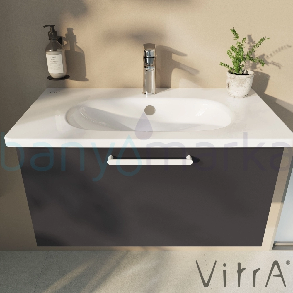VitrA Root Flat Tek Çekmeceli Lavabo Dolabı, 80 cm, Mat Fırtına Gri (Yuvarlak Lavabo Dahil)