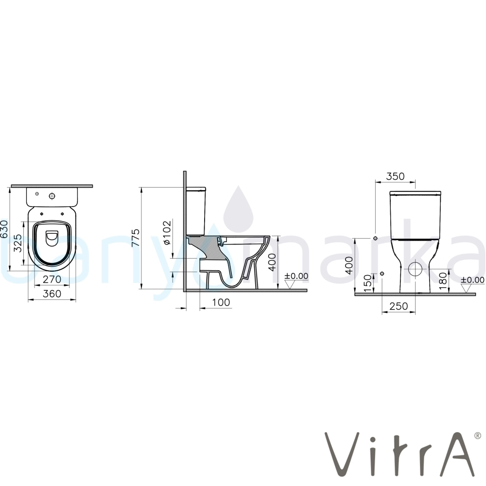 Su Tasarrufu: 3-6 litre Pis Su Çıkış: Universal Taharet Borusu Giriş: Standart Taharet Borusu: Var (Gizli-Standart) Yetkili Servis Hizmeti: Var Ücretsiz Montaj: Yok Garanti Süresi: 10 yıl Üretim Yeri: Türkiye Ölçüler: 360x630x400 mm Uyarı ve Genel Açıklamalar: 208-XXXR009, 210-XXXR009, 231-XXXR009, 85-XXXR009, 110-XXXR009, 131-XXXR009 kodlu duroplast, metal menteşeli, yavaş kapanır, kolay sök-tak, 210-XXX-009, 231-XXX-009, 85-XXX-009, 110-XXX-009, 131-XXX-009 kodlu duroplast, metal menteşeli, yavaş kapanır, standard, 121-003-909 kodlu nuvoplast, plastik menteşeli, yavaş kapanır, kolay sök-tak, 121-003-901 kodlu nuvoplast, plastik menteşeli, standart, kolay sök-tak klozet kapakları ile uyumludur, ürüne dahil değildir. Ayrıca sipariş verilmelidir. 7927L003-1253, 7929L003-0108, 7929L003-1253, 7925L003-0108, 7925L003-1253, 7927L003-0108 kodlu rezervuarlar ile uyumludur, ürüne dahil değildir. Ayrıca sipariş verilmelidir. Takım klozet, SmoothFlush, arkası açık, 63 cm. Universal çıkışlı, yandan yere montaj. Taharet borusu girişi standart uygulamalı. Garanti Bilgisi:10 Yıl Vitra garantisi -